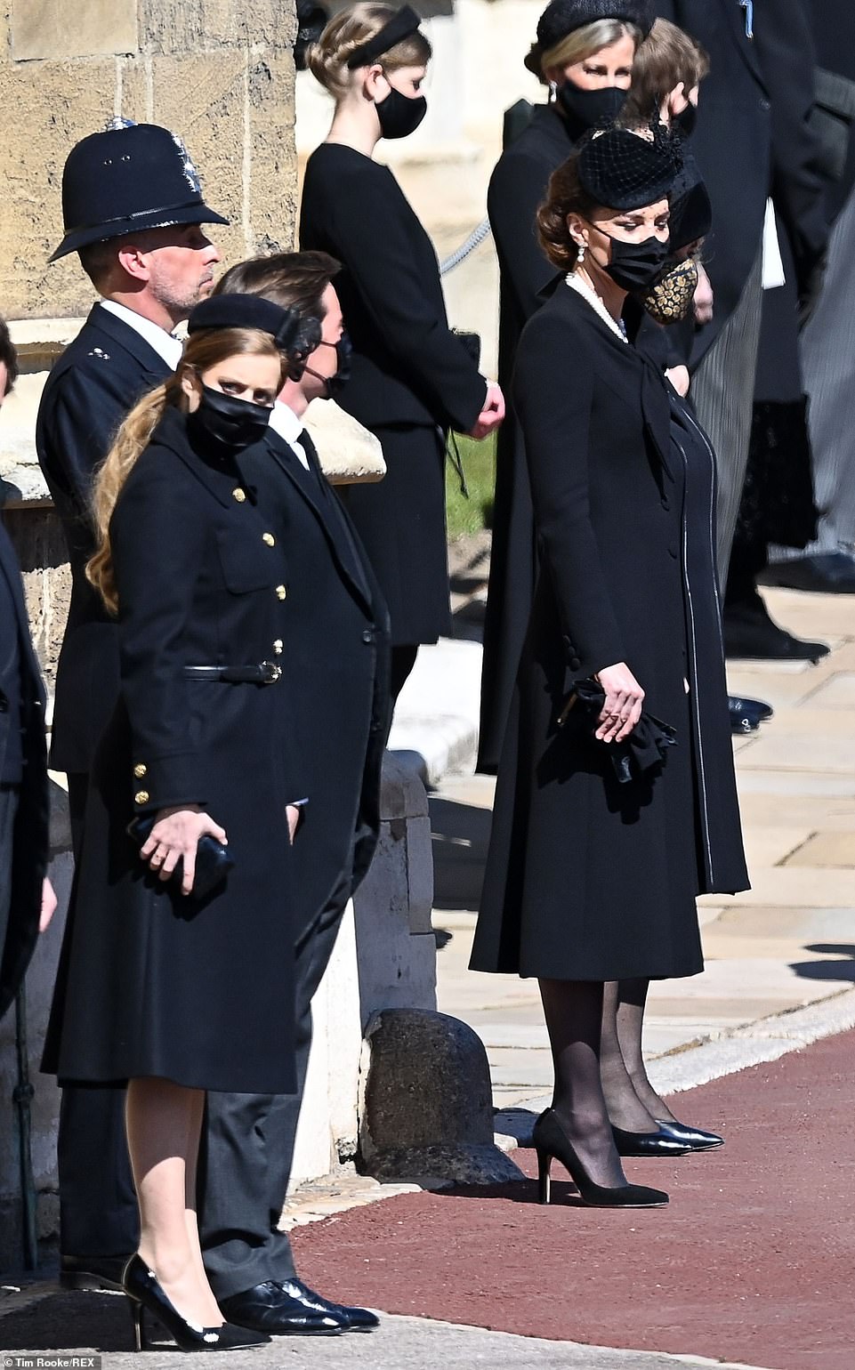 بدت الملكة اليزابيث برفقة دوقة كامبريدج والأميرات يوجيني وبياتريس بكامل أناقتهن بالزي الأسود وذلك أثناء حضورهم جنازة الأمير الراحل فيليب.