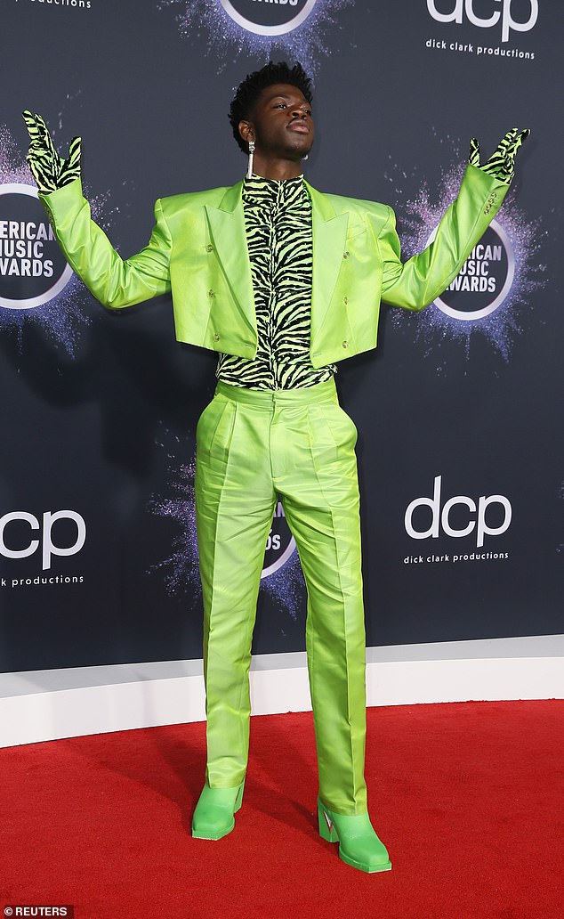 ارتدى مغني الراب الأمريكي إكس بدلة فاقعة اللون، من الستان الأخضر الفاتح، على قميص مطبع باللونين الأسود والأخضر ومزودا بالقفازات، ولم يترك مجالا للتعليق على اطلالته، فالكلمات تعجز عن الوصف في الواقع.