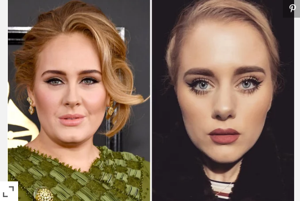 في هذه الصورة، تظهر كلًا من النجمة أديل وشبيهتها الألمانية "إلينور هيلبورغ" التي لم تتخلى أيضًا عن رسمتها المعهودة للآيلاينر، وذلك فضلًا عن العينين الزرقاء والشعر الأشقر!