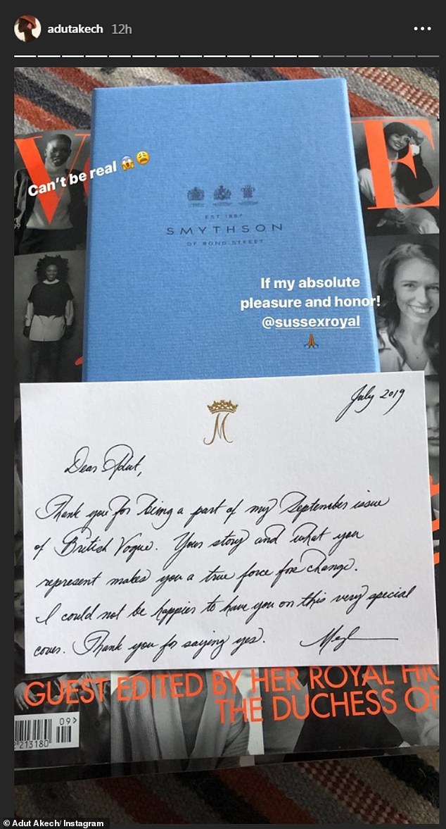 وكعربون للشكر أرسلت ميغان رسالة مكتوبة بخط اليد إلى أدوت بعد ظهورها في المجلة، فشاركت أدت صورة لهذه الرسالة عبر صفحتها الخاصة على إنستغرام.