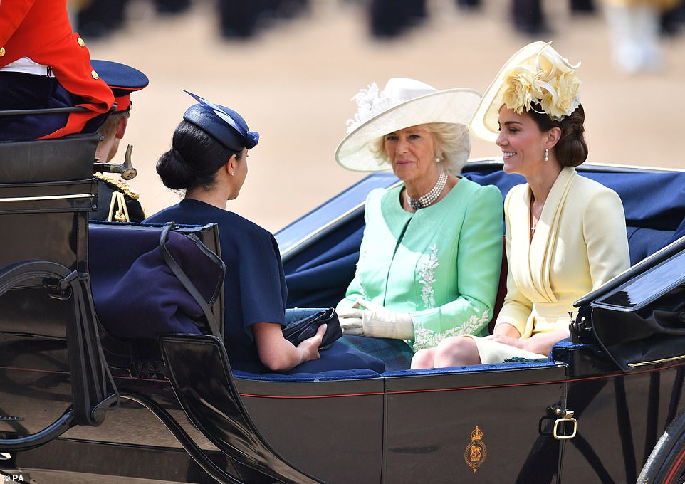 وبدت ميغان متألقة عند دخولها لقصر باكنغهام، حيث تم نقلها مع الأمير هاري في عربة خيول للإنضمام إلى العائلة المالكة لمشاهدة العرض، وتواجدت كيت ميدلتون وكاميلا في نفس العربة، إذ تبادلت ميغان الحديث معهما، ولكن لسوء حظ الجماهير فإن ميغان لم تحضر طفلها الجديد معها.