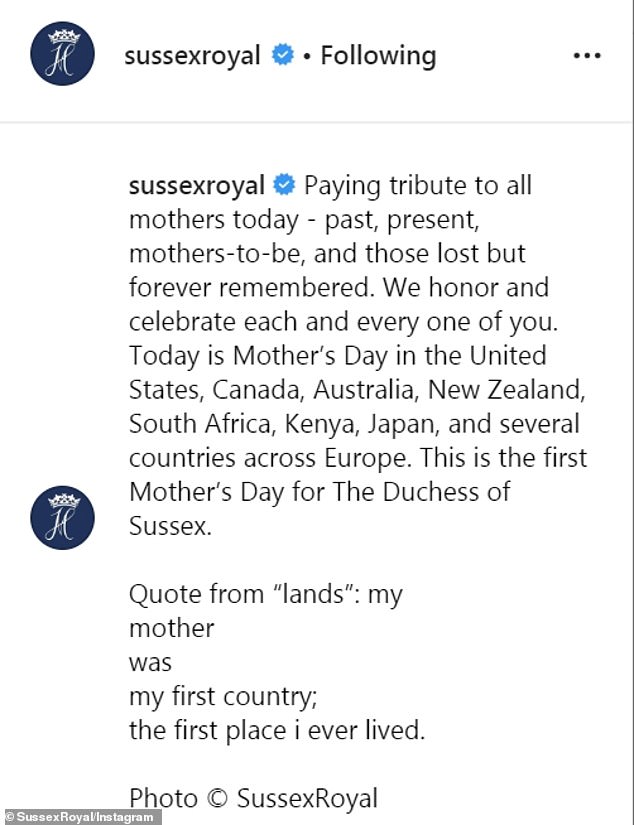 وخلال أقل من نصف ساعة حصلت الصورة على أكثر من نصف مليون إعجاب، حيث أرفقت الصّورة برسالة جاء فيها: "أشيد بجميع أمهات اليوم، الماضي، والمستقبل، واللواتي سيصبحن أمهات، نحن نحتفل بكل واحدة منكن"، كما أُضيف: "اليوم هو عيد الأم في الولايات المتحدة وكندا وأستراليا، والعديد من البلدان في جميع أنحاء أوروبا، وهذا هو يوم الأم الأول لدوقة ساسكس"، وغمرت المنشور الكثير من تعليقات المشاهير من أصدقاء ميغان الذين تمنوا لها يوماً سعيداً في أول عيد أم، كما شارك الحساب الرسمي لدوق ودوقة ساسكس مقاطع من قصيدة "Lands".