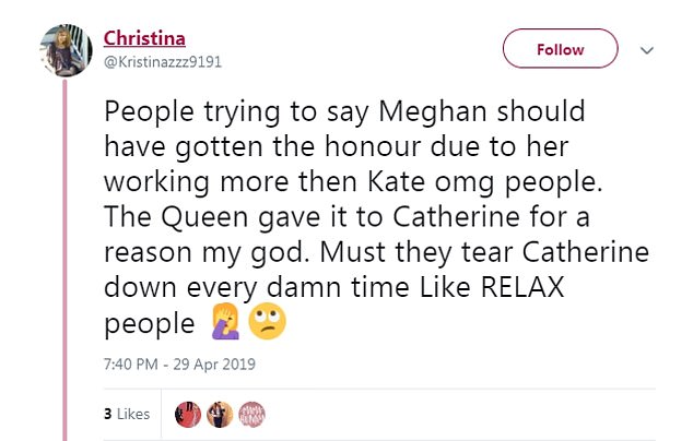 ودافع مؤيد آخر عن دوقة كامبريدج، وذكّر الآخرين بأن الجائزة هي تكريم شخصي من الملكة، حيث كتب: "إلى الناس الذين يُحاولون القول أنّ ميغان تستحق هذا الشرف لأنها عملت أكثر من كيت.. يا إلهي! فالملكة أعطت كيت هذا الشرف لسببْ! لماذا عليكم تمزيق كيت في كُلّ مرّة. اهدأوا يا ناس!".، وأضاف آخر "يبدو أن الجائزة لا تعطى حول عدد المشاركات، وإنما لمساعدة النظام الملكي أو تقديراً لبعض المناسبات المهمة".
