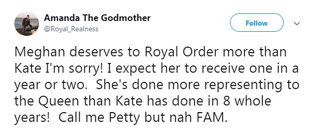 وبعد ساعات فقط من الإعلان عن الشرف، تم وضع التنافس المزعوم بين دوقة كامبريدج ودوقة ساسكس مرة أخرى في دائرة الضوء، حيث توجه مئات المعجبين إلى "تويتر" اليوم للتعليق على شرف كيت الجديد والدفاع عن ميغان، حيث قال أحد معجبي دوقة ساسكس: "إن ميغان تستحق الأمر الملكي أكثر من كيت أنا آسف! أتوقع أن تتلقى واحد خلال سنة أو السنتين القادمة، حيث أنها قدمت خدمات للملكة أكثر مما فعلته كيت في 8 السنوات الماضية".