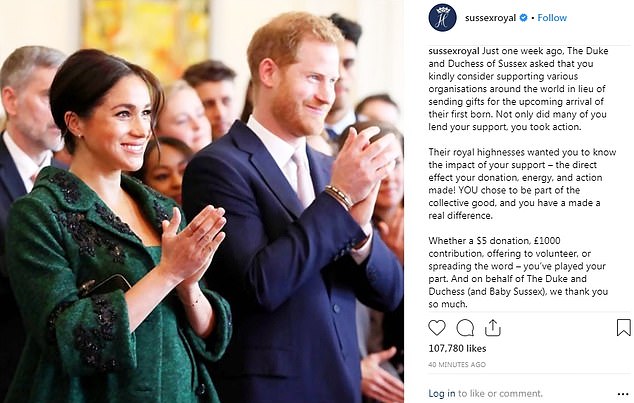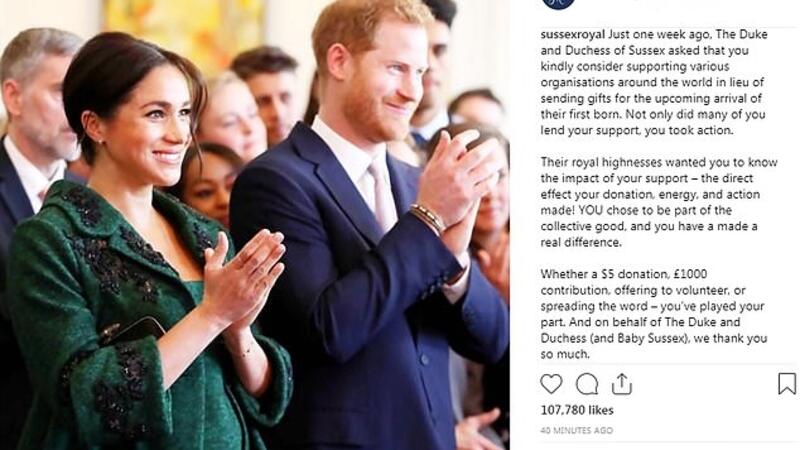 قبل أسبوع واحد، طلب الزوج الملكي من محبيه التبرع لأربع جمعيات خيرية بدل إرسال الهدايا للمولود، وأعربا عن سعادتهم بالتأثير الكبير الذي أدخله المحبون على نفسيهما حتى قبل وصول طفلهما أو طفلتهما والذي أسمياه "بيبي ساسكس" إلى العالم.