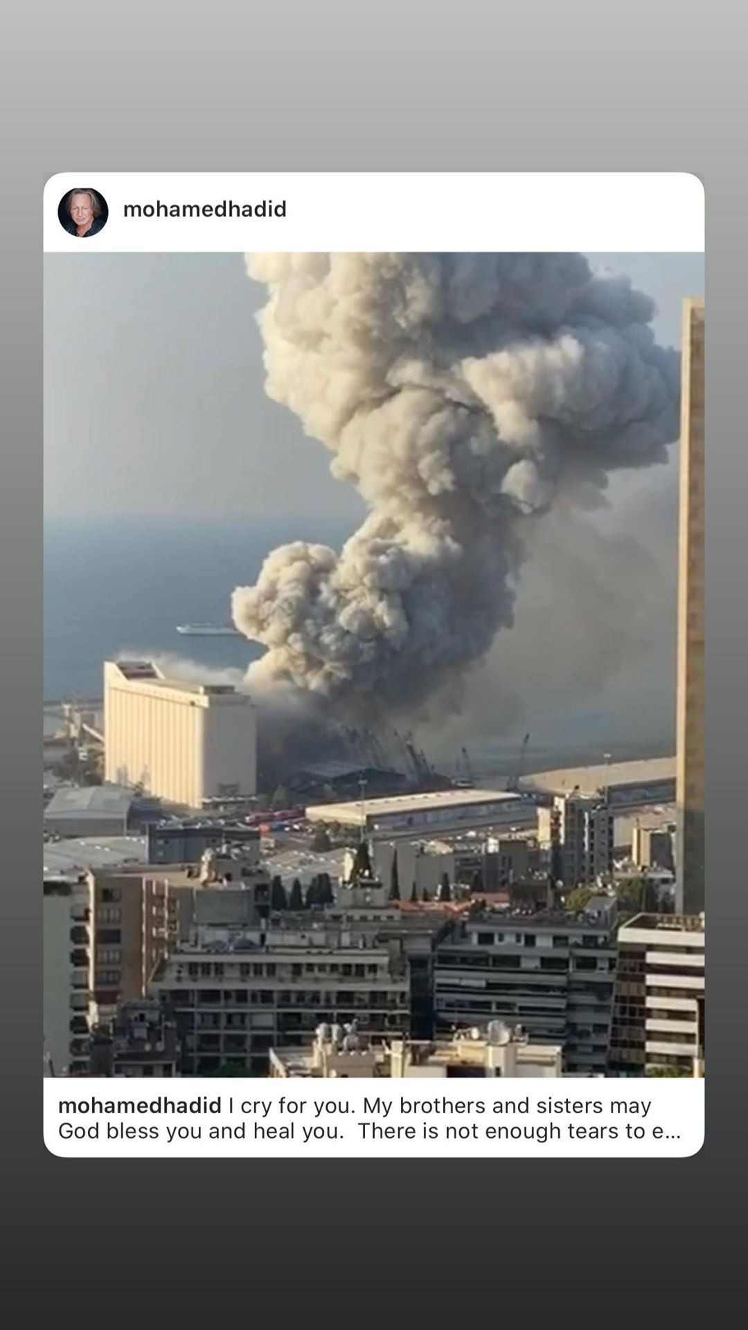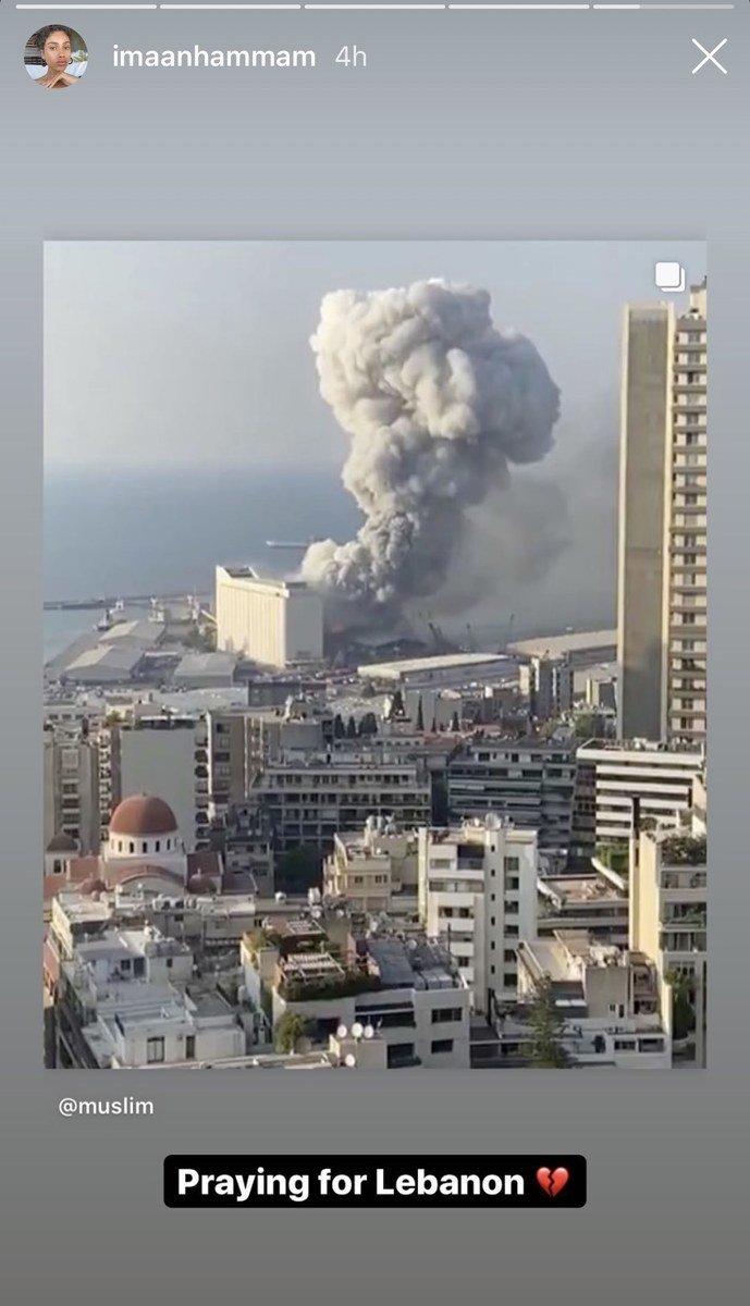 نشرت عارضة الازياء الهولندية ذات الأصول المغربية منشور يوثِّق لحظة الانفجار عبر خاصية "إنستغرام ستوري"، وكتبت: "أصلي للبنان".