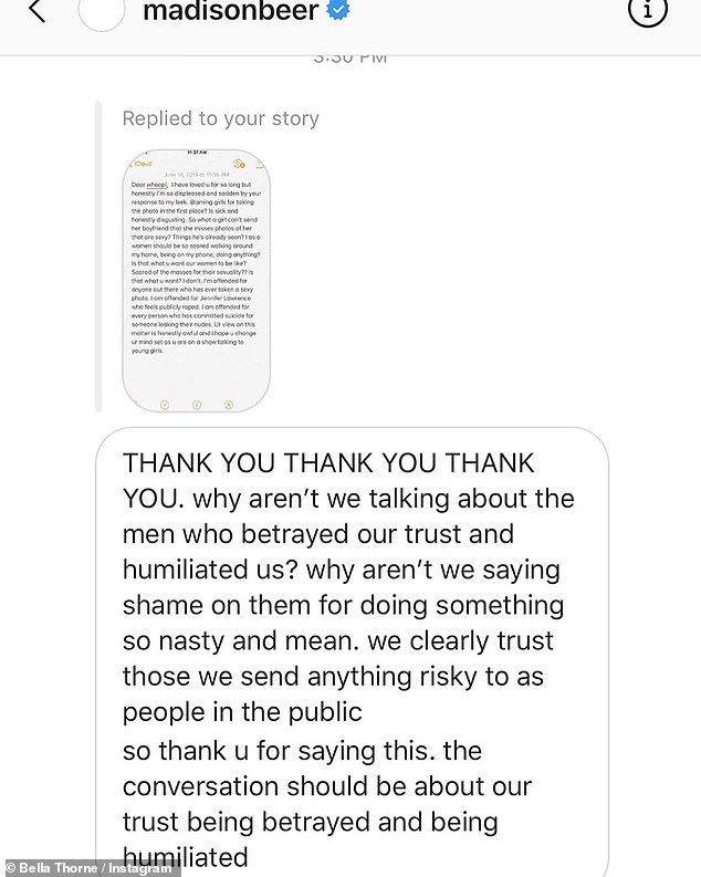 ألقت "ووبي" اللوم على "بيلا" خلال تقديمها البرنامج الحواري View، بقولها: "لا يهمني كم عمرك، لكن لا تلتقطي صوراً عارية لنفسك"، حينها قررت "بيلا" الرد عليها عبر مقطع فيديو، قالت فيه: "عار عليكِ يا ووبي، إنه ليس من الجميل وضع هذه المسألة كموضوع نقاش، ستصبح كل فتاة تفكر في أنها مثيرة للإشمئزاز قبل أن تلتقط لنفسها صورة عارية"، كما أضافت وهي تبكي: "أنا لا أكذب عليكِ، لقد شعرت بالإشمئزاز إلى حد كبير يا ووبي، فمعرفة أن الجميع ينظر إلي كأني فتاة سيئة هو ما جعلني أشعر بذلك، آمل أنك سعيدة الآن."