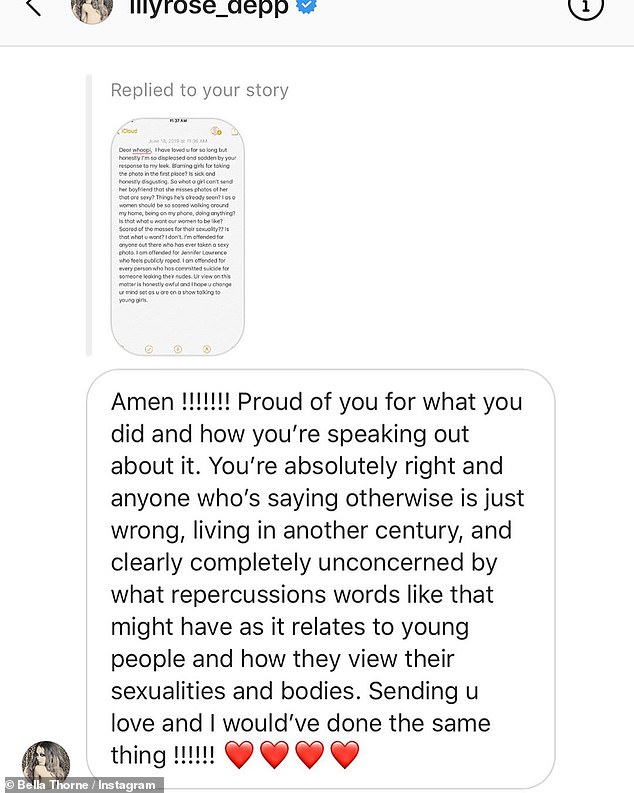 إأرسلت ابنة النجم العالمي "جوني ديب" رسالة لصديقتها، كتبت فيها: "آمين! فخورة لما قمت به والطريقة التي تحدثت فيها عن الموضوع.. أنت على حق، وكل من يخالفك على باطل، فهم يعيشون في عصر مختلف، كما لا يدركون مدى تأثير كلماتهم على الشباب الصغار لأنها ترتبط بالجنس والجسد.. أرسل لك حبي وكنت سأفعل ما فعلته."