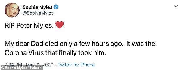 واختارت "صوفيا مايلز" حسابها على موقع التغريدات القصيرة "تويتر" لتكشف الأخبار المؤسفة، فكتبت: "فلترقد بسلام بيتر مايلز، توفي والدي العزيز قبل ساعات قليلة، والسبب فيروس كورونا."