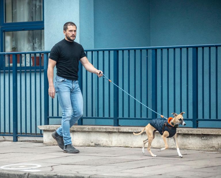 رصدت عدسات الباباراتزي النجم الإنجليزي "كيت هارينغتون" يتنزه برفقة كلبه، وأطلَّ حليق الشعر مُتخليًا عن شعر الأسود الطويل المموَّج، واستعرض جسده الرياضي وعضلاته المفتولة مُرتديةً تيشيرت أسود وبنطال جينز أزرق، وانتعل حذاء أسود مريح.