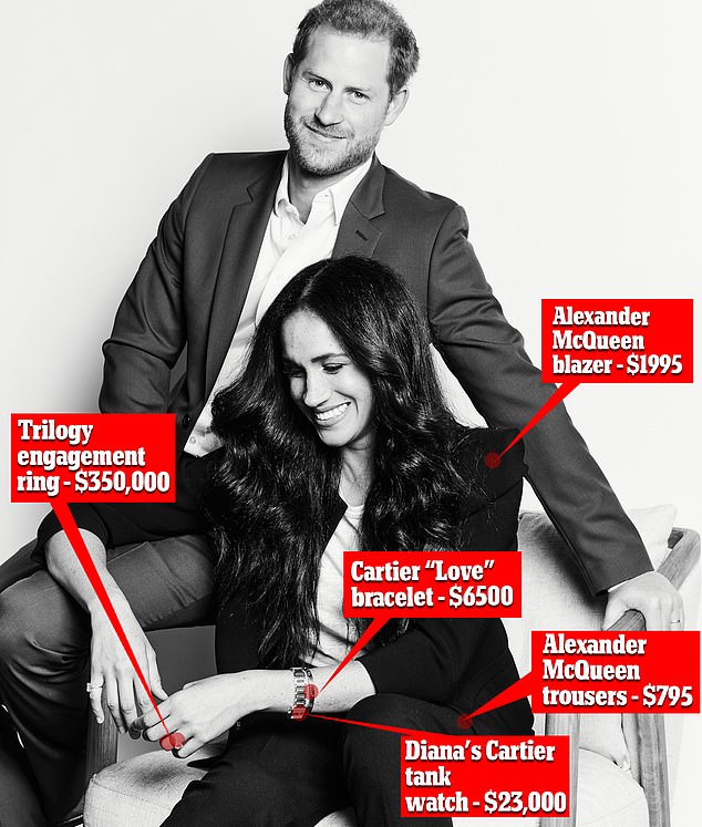 من جهة أخرى، ارتدت "ميغان" (39 عامًا) بذلة سوداء أنيقة من تصميم "أليكساندر ماكوين" يبلغ سعرها 3 آلاف دولار، وتزيَّنت بخاتم خطوبتها الألماس الذي يقدر سعره بـ350 ألف دولار، وساعة كارتييه ذهبية بقيمة 23 ألف  تعود لحماتها المتوفاة، بالإضافة إلى اسوارة الحب الخاصة بـ"كارتييه" يقيمة 6.6 ألف دولار.