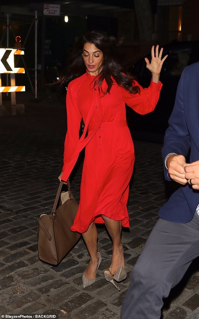 فظهرت زوجة النجم جورج كلوني بفستان أحمر ذو أكمام طويلة ويبلغ حد الركبة بينما كانت تنتعل حذاء باللون البيج وبكعب عالي وأثناء مسيرها تعثّرت بالشارع مما أدى إلى اتفاف قدمها وخلع حذائها.
