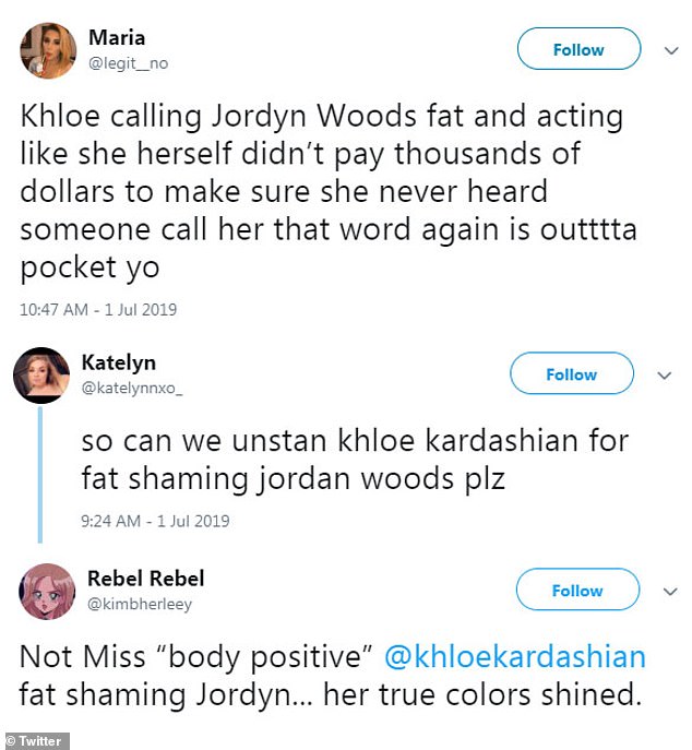 وهاجم المعجبين كلوي بقولهم: "وكأن كلوي لم تدفع آلاف الدولارات حتى لا تسمع أحد يناديها بالسمينة"، كما أضاف آخر: "إن كلوي كادت أن تفقد عقلها بسبب مناداتها بالسمينة، وكانت تبكي لسنوات بسبب خجلها من جسمها أمام الإعلام".