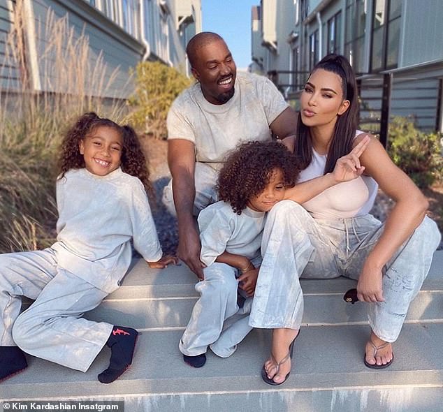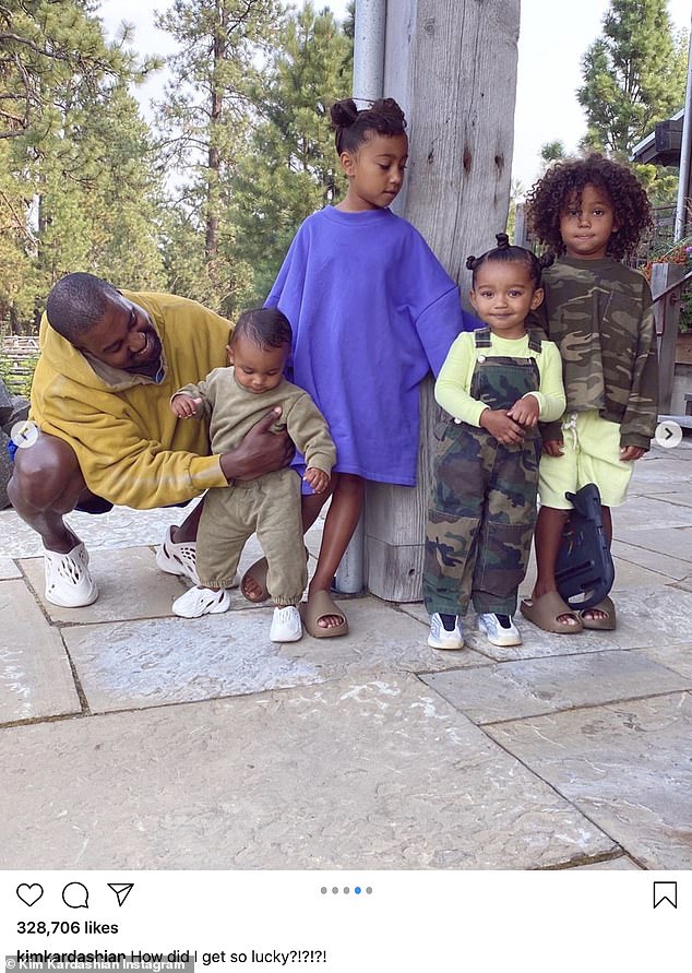 Leading separate lives? Kim Kardashian West has returned to Los Angeles while Kanye West remains in Wyoming (Pictured above with children North, 7, Saint, 4, Chicago, 2, and Psalm, 1)
