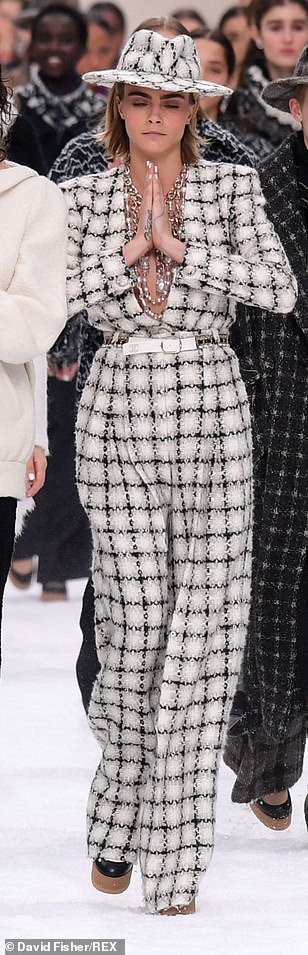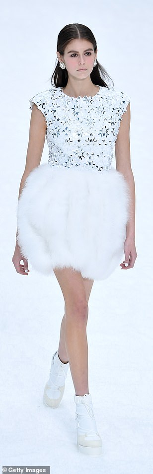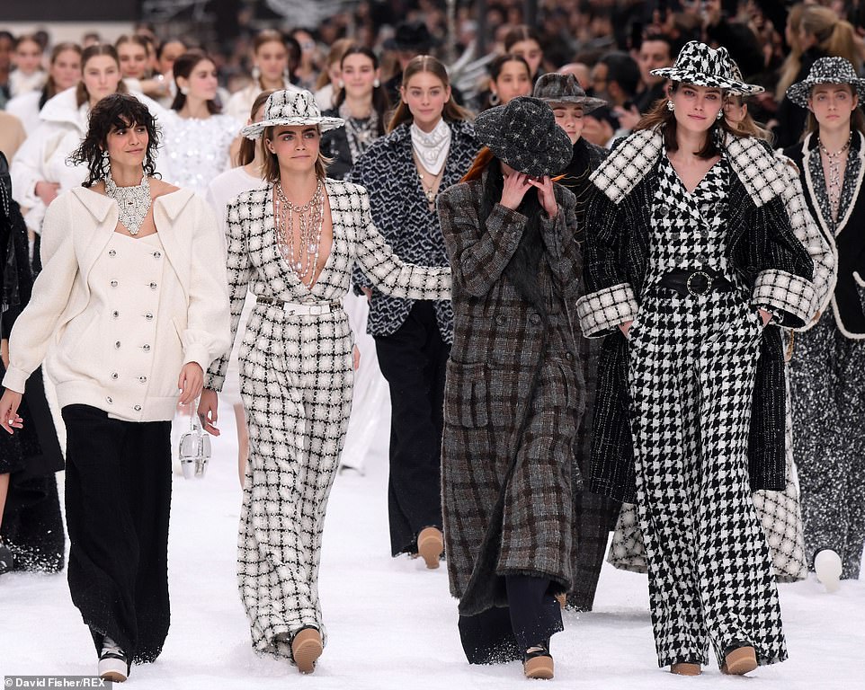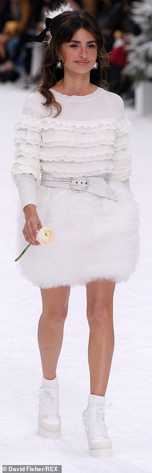 وسارت العارضتان جنبًا إلى جنب مع الممثلة "بينلوبي كروز" (44 عامًا)، الوجه الإعلامي للعلامة، والتي بدت في غاية الجاذبية والأنوثة في فستان أبيض قصير ذو تنورة من الفرو، وأكملت إطلالاتها بحمل وردة بيضاء، في إشارة إلى لاغرفيلد.