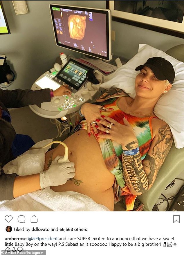 وشاركت أمبر صورة لبطنها العاري، بينما كانت تحصل على صورة Sonogram في عيادة الطبيب، وعلّقت: "نحن نعلن أننا ننتظر طفلاً حلواً صغيراً في الطريق، نحن متحمسون لذلك"، وأضافت "أنا سعيدة للغاية أن يكون لدى سبيستان شقيقاً صغيراً".