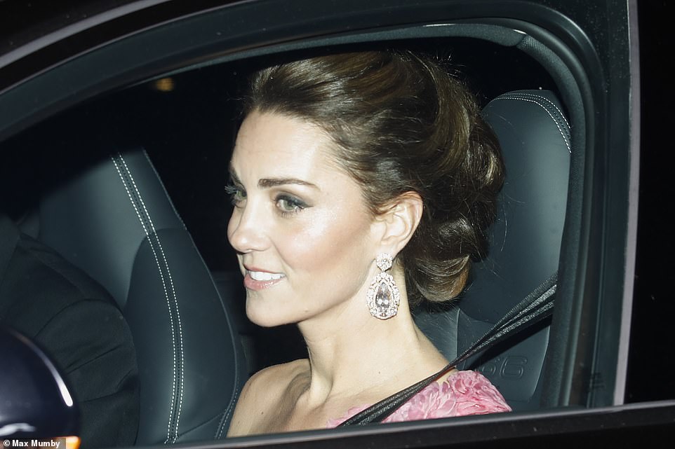 رَصدت عدسات الكاميرات الأمير "ويليام" ودوقة كامبريدج "كيت ميدلتون" يتوجهان إلى الحفل الذي تستضيفه الملكة إليزابيث الثانية داخل سيارة دفع رباعية، وتظهر لمحات بسيطة من إطلالة "كيت" التي ارتدت فستان وردي كروس شولدر غاية في الأناقة والرقي، وما زادها جمالًا تَزيُّنها بأقراط ألماسية متلألة على شكل كُمثرى.
