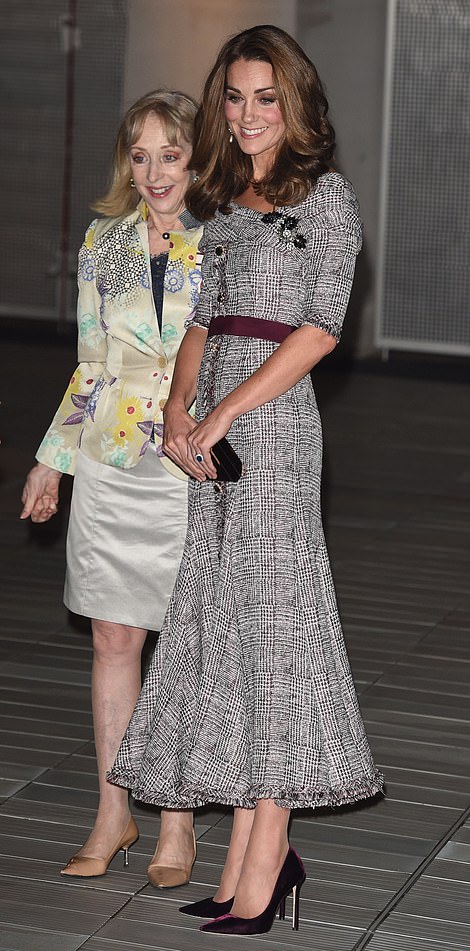 وبدت "كيت" غاية في الأناقة مرتديةً فستانًا من مجموعة أزياء المصمم الكندي ذو الأصول التركية "إرديم موراليوجلو" لموسم ربيع وشتاء 2018 بلغ قيمته 1,295 جنيه استرليني، الذي جاء بتصميم فستان ماكسي أنيق مُزيَّن بنقشات على شكل كاروهات صغيرة باللونين الأبيض والأسود والأرجواني، وأضيف له حزام أرجواني من قماش الساتان لإضفاء مزيدًا من الأناقة لمظهرها، بالإضافة إلى تفاصيل أنيقة من بينها الأزرار السوداء وبعض الورود التي زيَّنت الياقة.