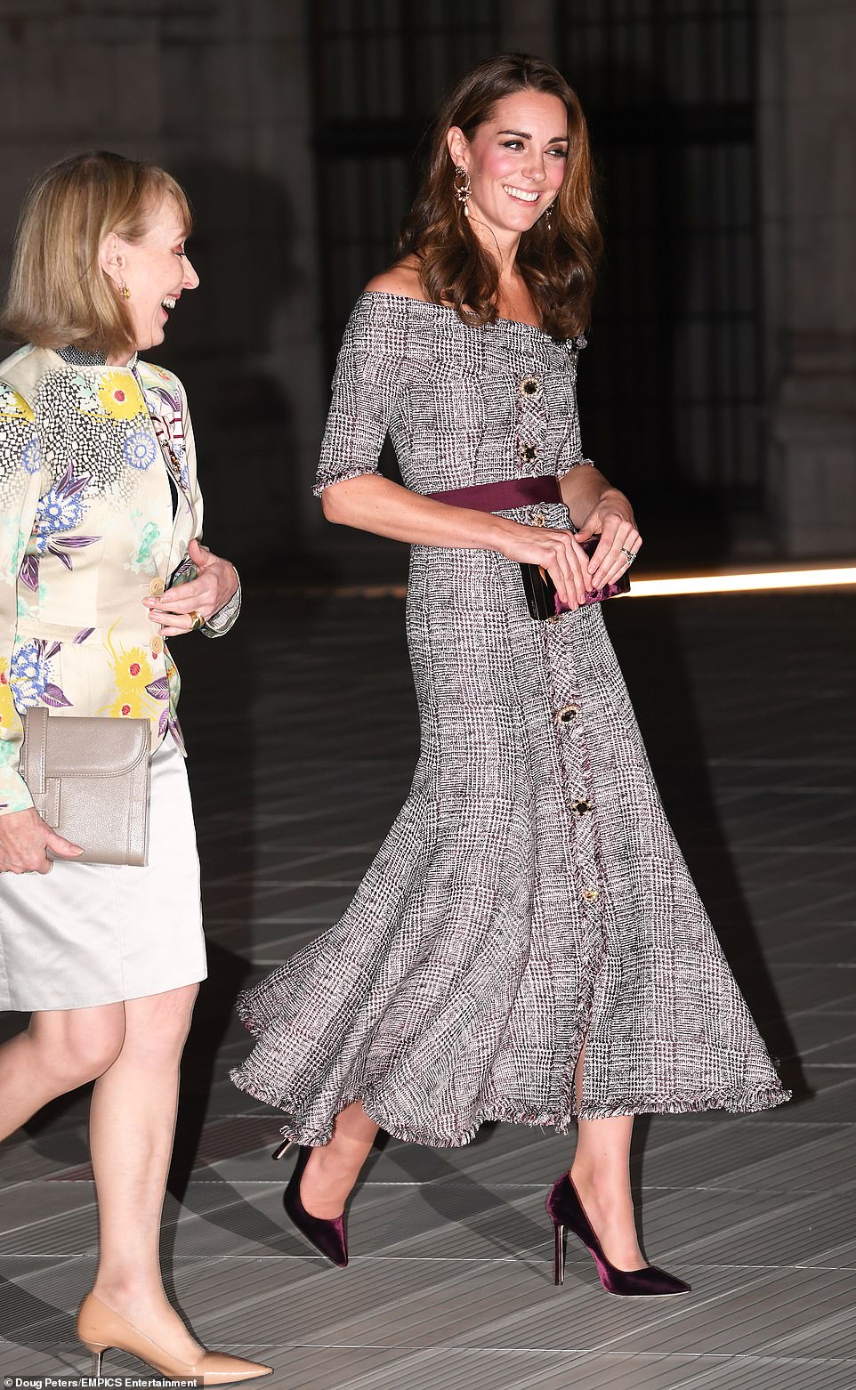 وأكملت الدوقة، البالغة من العمر 36 عامًا، إطلالتها المذهلة بترسيحة شعر مموجة أسدلتها على جانبي كتفها بانسيابية، كما انتعلت حذاء مخملي أرجواني اللون ذو كعب عالٍ، وحملت كلاتش أسود مُزين بزخارف مبهرة، وتزيَّنت بأقراط ذهبية من ذات العلامة بقيمة 290 جنيه استرليني.