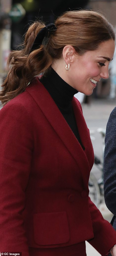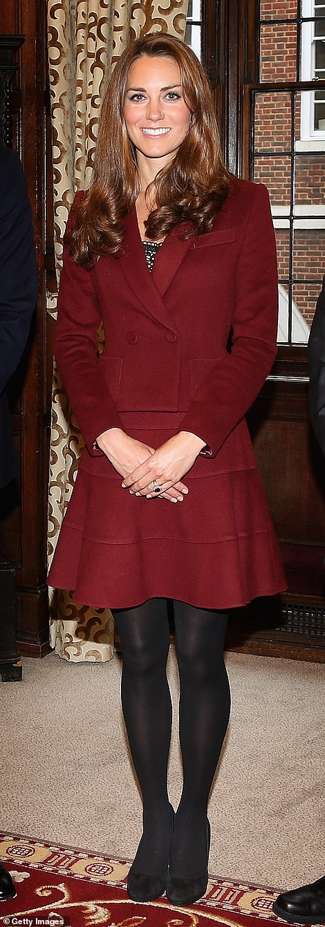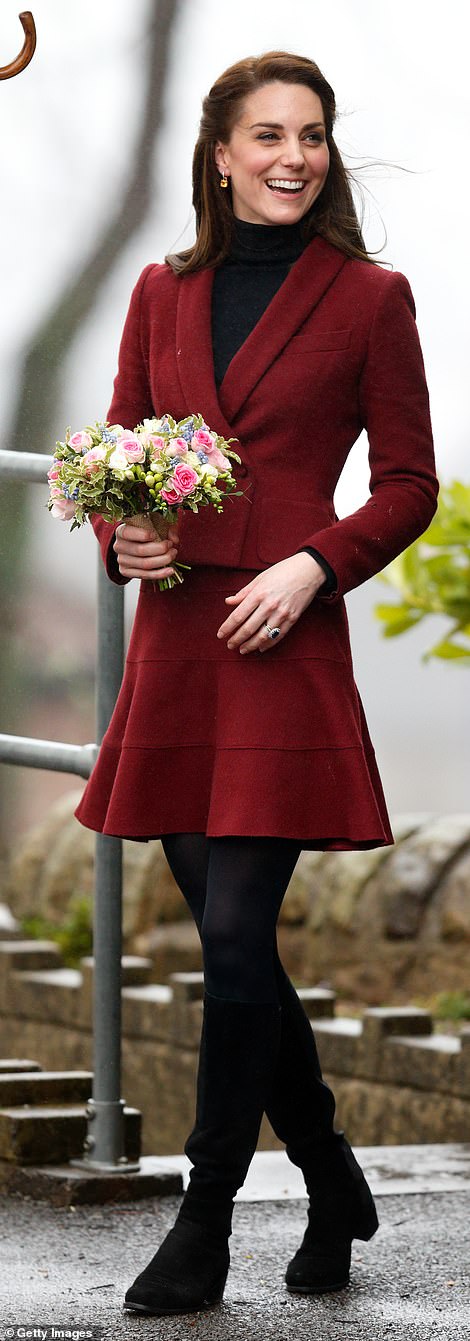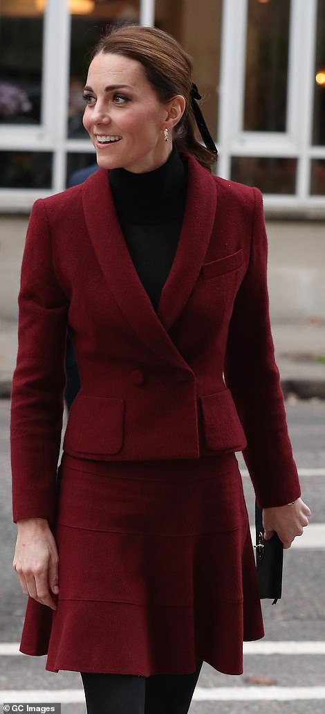 وتألقت السيدتان بإطلالات أنثوية باللون الخمري، فاختارت "كيت" ارتداء طقم مكوَّن من بليزر وتنورة من العلامة التجارية الفرنسية "باول كا" نسَّقته مع جوارب سوداء شفافة، وانتعلت جزمة مخملية سوداء ذات رقبة عالية.