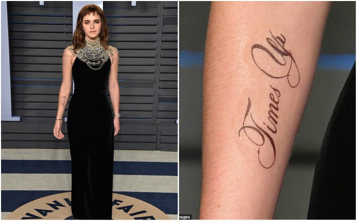 حاولت النجمة البريطانية "إيما واتسون" إظهار دعمها لحملة "Time's Up"، التي توفر دعمًا ماليًا وقانونيًا للدفاع عن النساء والرجال الذين تعرضوا للتحرش الجنسي، عن طريق رسم وشم مؤقت على ذراعها اليمنى كتب عليها اسم الحملة.