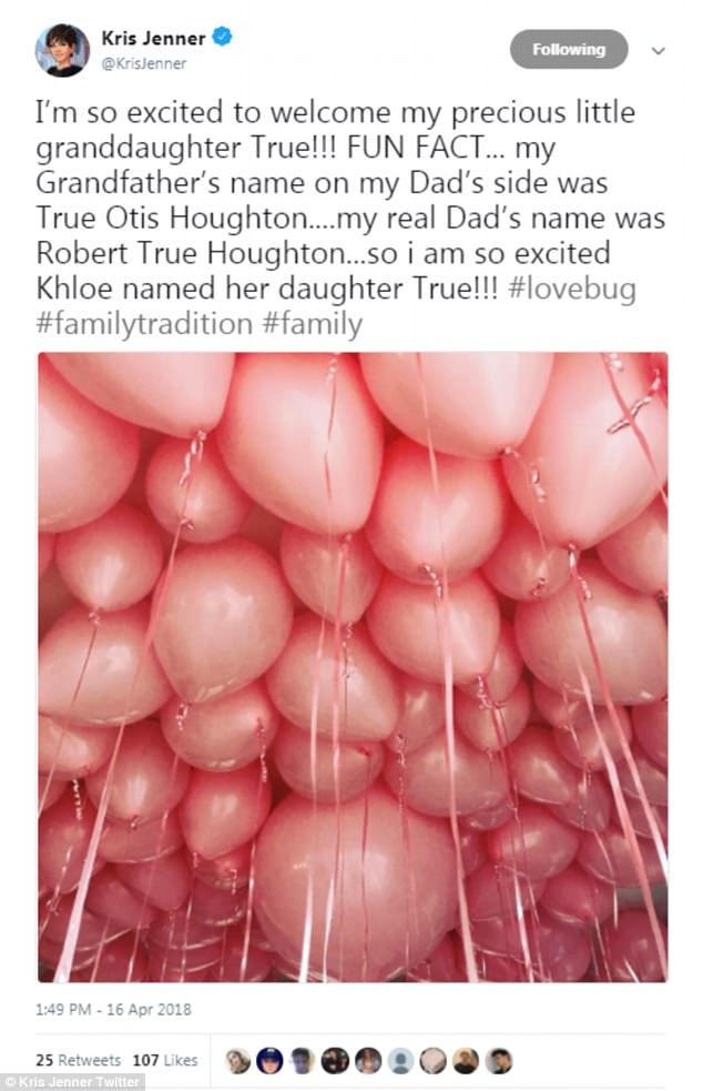 ونشرت صورة أخرى عبر موقعها الخاص، كتبت فيها: "ترو تومسون، ولدت بتاريخ 12 أبريل عام 2018، تزن 6 أرطال و13 أونصة، وطولها 21 إنشًا...والديك الفخورين "تريستان تومسون" و"كلوي كارداشيان"."