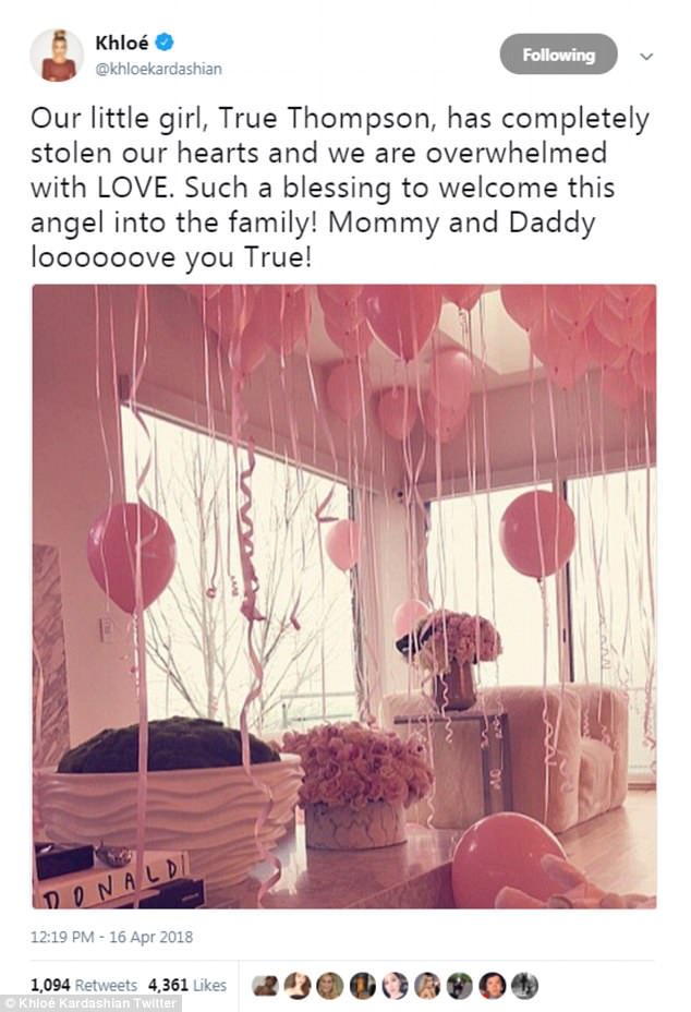 رحبت نجمة تلفزيون الواقع "كلوي كارداشيان" بابنتها الأولى من حبيبها الخائن لاعب كرة السلة "تريستان تومسون" بتاريخ 12 أبريل من العام الجاري.
