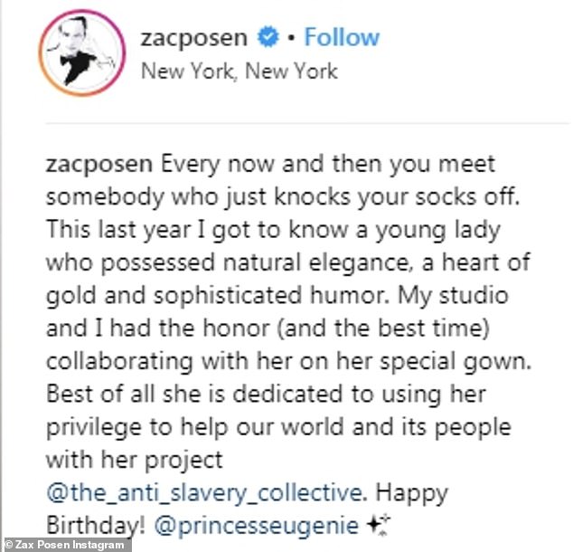 وعقب تهنئته لها بعيد ميلادها، أشاد زاك بالأميرة يوجيني وسلوكها الطيب، حيث علّق بجانب الصورة: "بين الحين والآخر، تقابل شخصاً يثير حماسك، وفي العام الماضي قابلتٌ سيدة تمتلك أناقة طبيعية وروحاً مرحة وتحمل قلباً من ذهب"، وأضاف بوسين " الأفضل من ذلك كله، هي أنها تكرّس لقبها وامتيازتها لمساعدة العالم ومساعدة شعبها في مشروعها الخاص 'مكافحة العبودية الجماعية'، لقد استمتعتٌ بوقتي معها وأنا أصمم لها الفستان".