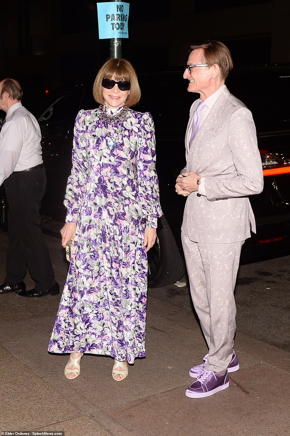 اعتمدت الصحفية البريطانية ومحررة مجلة فوغ السابقة، آنا وينتور إطلالة ربيعية لافتة، حيث ارتدت فستانًا طويلًا مغطى بنقشات الورود بدرجات من الوردي والأرجواني مع الرمادي، وتميز الفستان بياقة عالية وبعض الكسرات.