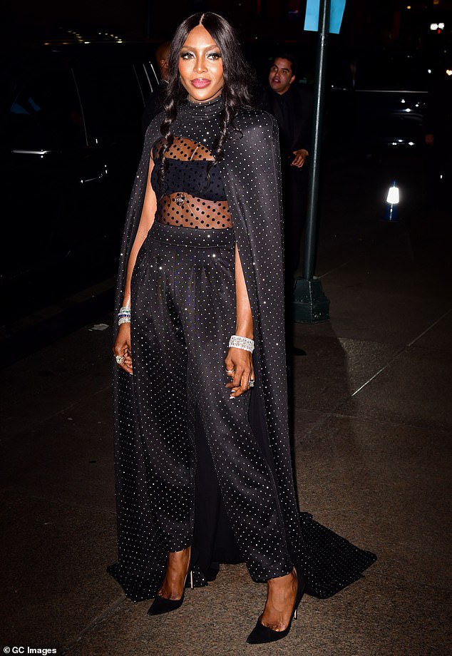بدت كامبل (48 عامًا) في غاية الجاذبية، في إطلالة جمعت بين الأناقة والعصرية بطلها الأسود، حيث ارتدت بنطلونًا فضفاضًا نسقته مع توب شفاف بنقشة البولكا دوت يكشف عن حمالة صدر باللون الأسود، في إطلالة مميزة مغطاة بأحجار الراين المتلألئة، وأبرز ما ميّز إطلالتها، هو ذلك الكاب الأنيق الذي أضفى لمسة ملكية لإطلالتها.