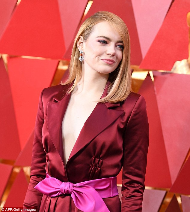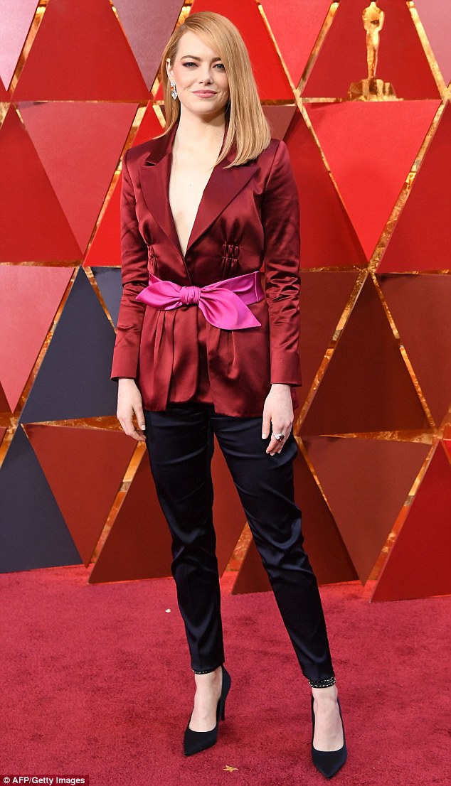 تجرّأت ستون، واسمها الحقيقي "ايملي روز ستون" على التخلي عن الفُستان كباقي الفنانات، لكنّ جُرأتها كانت في محلّها لأنها اختارت ارتداء بدلة نسائية من علامة "لويس فيتون"، فتألّقت ببليزر خمري مكشوف الصدر، زمّت خصره بحزامٍ وردي يُشبه الرّباط، ونسقته مع بنطال أسود بسيط التصميم، كما أضافت القليل إلى طولها بانتعال كعب عالي أسود.