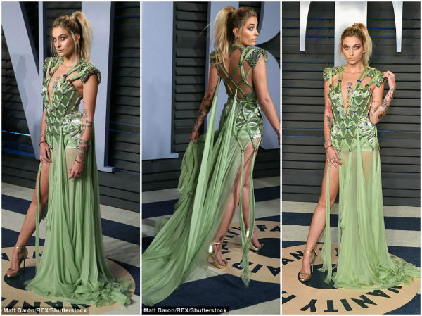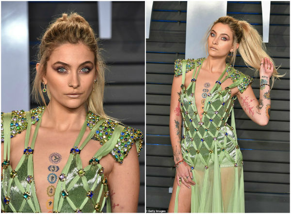 وأطلّت "باريس" في الحفل بـJumpsuit "مثير" من versaceباللون الأخضر صُمم بطريقة اتسمت بالجرأة والإثارة كاشفًا الوشوم التي ملأت جسدها، والذي أضيفت له وصلات من قماش الشيفون.