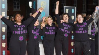 اقتحمت مجموعة من المتظاهرات حفل توزيع جوائز "بافتا" لدورته الـ71 مرتديات تيشيرت أسود اللون مكتوب عليه شعار " Time’s Up Theresa" أي "انتهى الوقت تيريزا".
