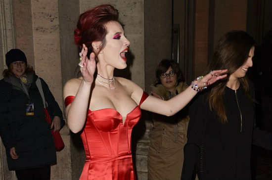 وكما جرت العادة، لا تستطيع "بيلا" الا وأن تضع لمساتها المجنونة على إطلالاتها، فتعمدت وضع ظل عيون باللون الوردي الصارخ وصبغت شعرها باللون الأحمر، مع الكثير من الأساور المزركشة بيدها.