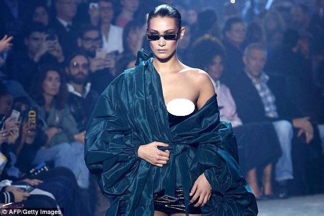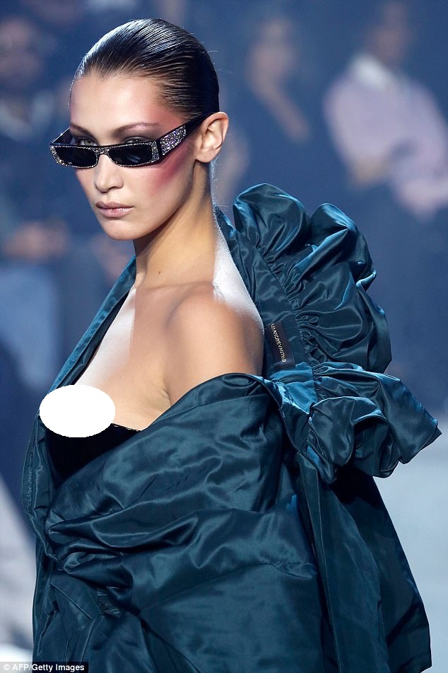 اتجهت الأنظار ناحية إطلالة بيلا حديد "20 عامًا" حين اعتلائها منصة عرض الأزياء في باريس، لكن ليس ناحية إطلالتها المبهرة، بل بسبب كشف جزء من صدرها لا يجب أن يظهر على المنصة؛ فخلال سيرها انزلق قليلًا فستان السترابلس القصير ما كشف حلمة صدرها.