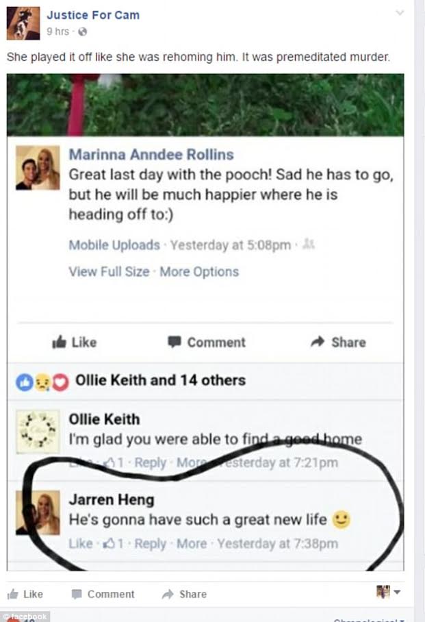 تصرّف لا يمتّ إلى الإنسانية بصِلَة، وبعيد كل البعد عن الرفق بالحيوان، قامت به الجندية الأمريكية السابقة "مارينا رولينز" 23 عاماً عندما قتلت كلبها "كام" بمساعدة حبيبها الجندي "جيرين هينغ" 25 عاماً.