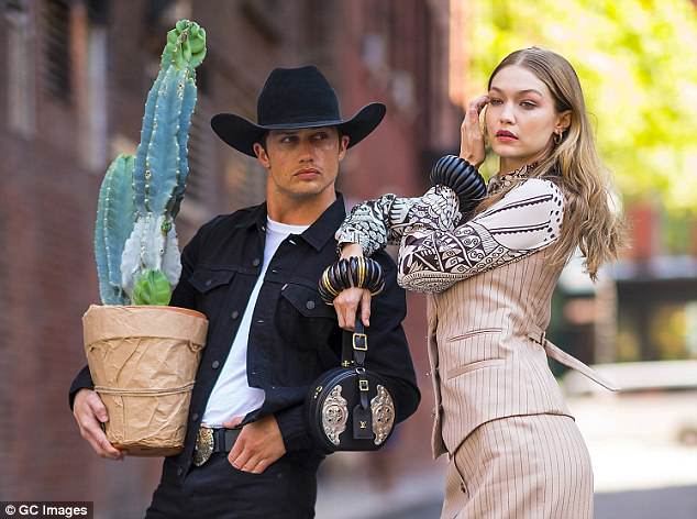 وفي إحدى الصور، تظهر جيجي تضحك بانفعال إلى جانب عارض أزياء وسيم ارتدى هو الآخر قميص جينز وسترة شاموا بنية عسلية، وأكمل إطلالته ببنطال دنيم أزرق، وقبعة رأس تناسب رعاة الأبقار.