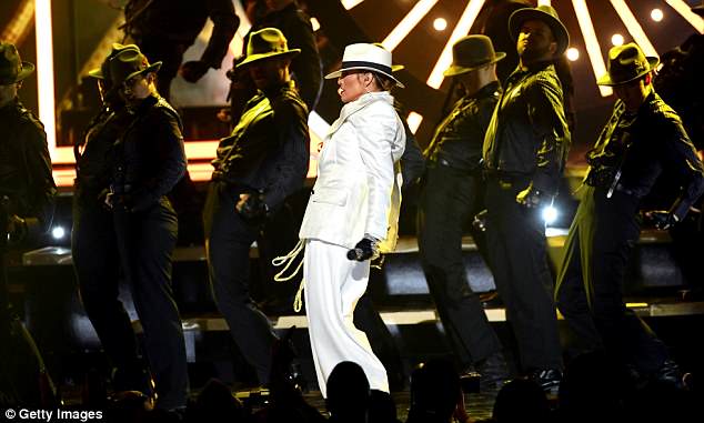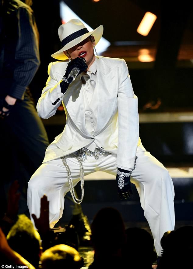 أطلقت لوبيز العرض بارتدائها بدلة بيضاء من رأسها إلى أخمص قدميها، كما نسقت معها ربطة عنق بيضاء، وقبّعة بيضاء، وقفّازات سوداء.
