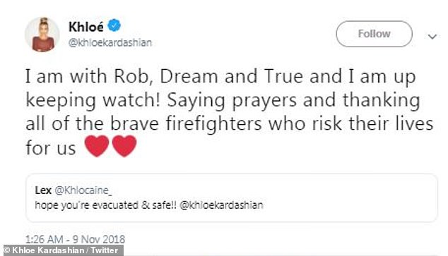 أخلت فتاة كارداشيان الصّغرى منزلها الواقع في كالاباساس برفقة رضيعتها ترو، وهربت إلى منزل شقيقها "روب كارداشيان"، حيث غرّدت عبر حسابها في موقع تويتر قائلةً: "أنا مع روب ودريم وترو مُستيقظة لكي أراقب ماذا يحصل. أدعو للجميع وأفكّر برجال الإطفاء هؤلاء الذين يُخاطرون بحياتهم من أجلنا".