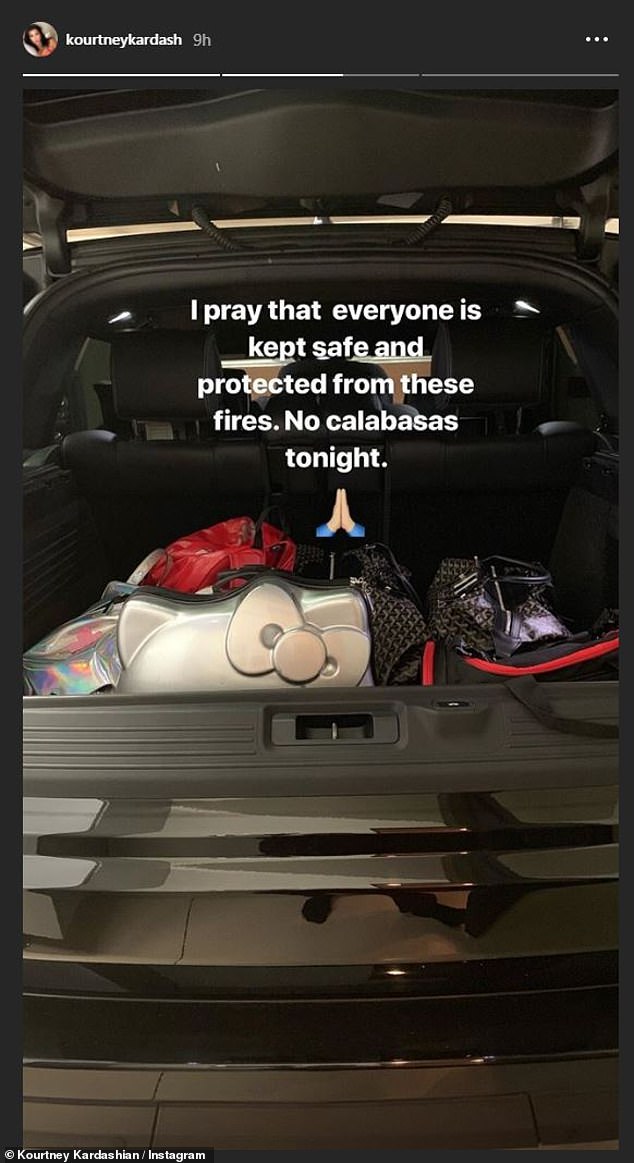 أخلت كورتني كارداشيان منزلها هربًا من الحرائق التي قد تصل إليه، وتوجّهت للإقامة في منزل شقيقتها كيندال جينر البعيد عن موقع الحرائق، فنشرت صورة عبر حسابها في إنستغرام وهي تنقل أمتعتها إلى السّيارة، كما دعت للجميع في هذه الأوقات الصّعبة.