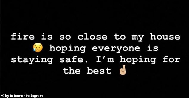 من حُسن حظ كايلي ووالدتها كريس جينر أنهما في أقصى الشّرق الأمريكي تحضران فعاليات عروض أزياء فيكتوريا سيكريت السّنوية، بعيدًا عن أقصى الغرب الكاليفورني الذي ضربته الحرائق، لكنّ كايلي جينر في حالة قلقة جدّاً على منزلها الواقع في كالاباساس، حيث نشرت صورة عبر إنستغرامها قالت فيها: "النّيران قريبة جدّاً من منزلي. أتمنى أن يكون الجميع بخير وأتمنى الأفضل للكُل".