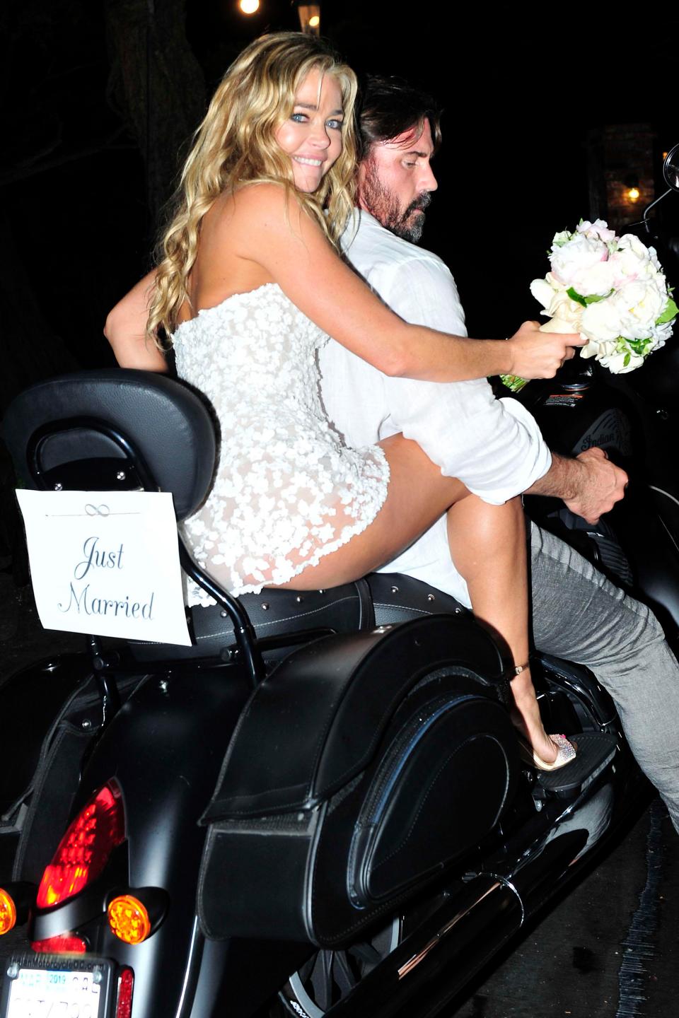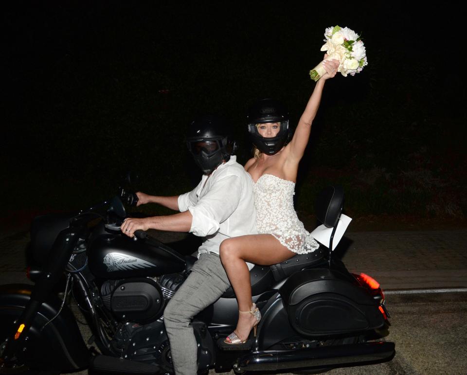 ولم يكن فستان زفافها مما أثار الجدل، إذ غادرت النجمة الحسناء الحفل على متن دراجة نارية جلست فيها وراء زوجها الذي تشبَّثت به بإحكام.
