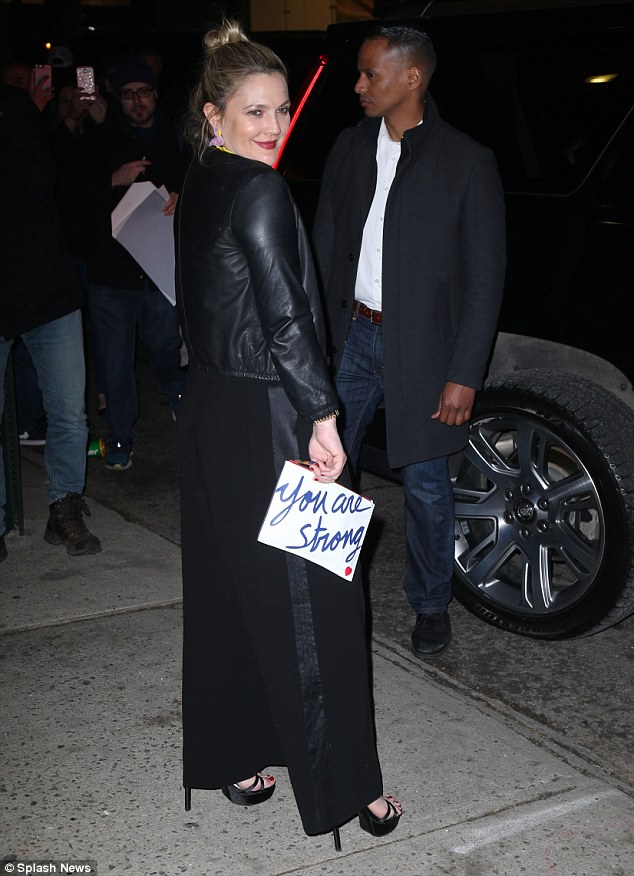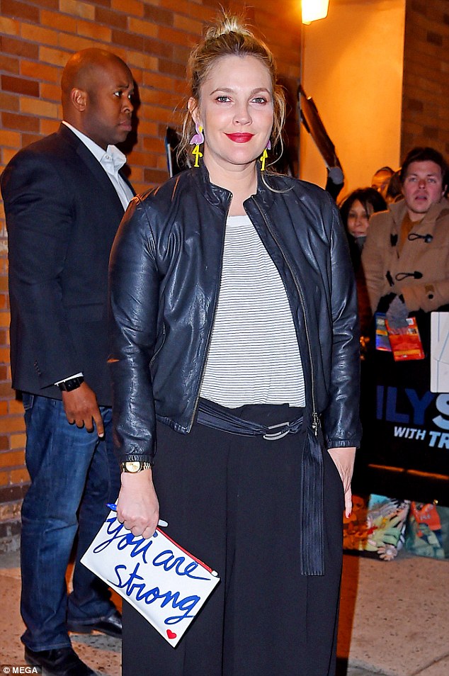 تألقت "درو باريمور" (43 عامًا) بإطلالة جلدية غاية في الأناقة مرتديةً سترة جلدية سوداء تخص راكبي الدراجات، نسقتها مع بنطال عريض أسود فضفاض، وأكملت إطلالتها ممسكةً حقيبة يد كتب عليها بالإنجليزية "أنت قوي" من مجموعة أزيائها dear drew، وذلك خلال حلولها ضيفة في برنامج The Daily Show مع مقدم البرنامج "تريفور نوح" يوم أمس الثلاثاء في نيويورك.
