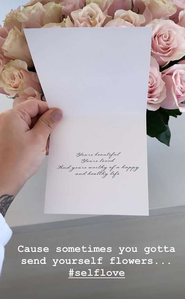 منحت النجمة الأمريكية "ديمي لوفاتو" نفسها بعض الإمتنان والحب وتقدير الذات عبر إهداء نفسها باقة من الورود الجميلة مُرفقة ببطاقة مكتوب فيها بعض العبارات التشجيعية والمُحفزة.