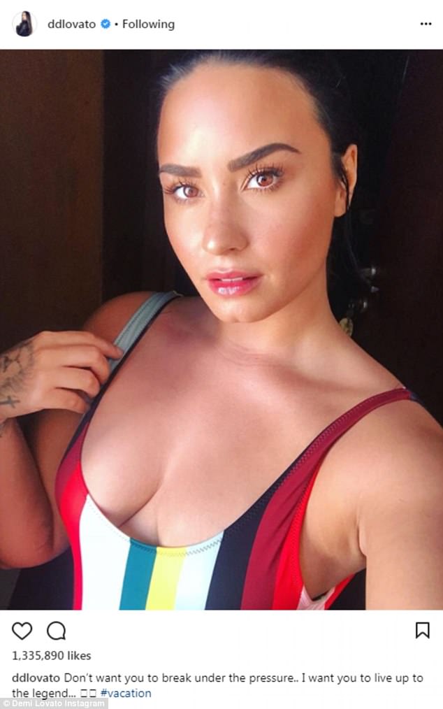 وفي آخر صورة لها نشرتها عبر حسابها على موقع "إنستغرام"، استعرضت "لوفاتو" (25 عامًا) جسدها بصورة سيلفي مرتديةً لباس سباحة من قطعة واحدة مخطط طوليًا بألوان متعددة من العلامة التجارية " Solid and Striped" بقيمة 121 جنيه استرليني كاشفًا جزءًا من صدرها، في حين نظرت بعينيها البنيتين ناحية عدسة الكاميرا مبرزةً جمال ملامحها الجذابة.
