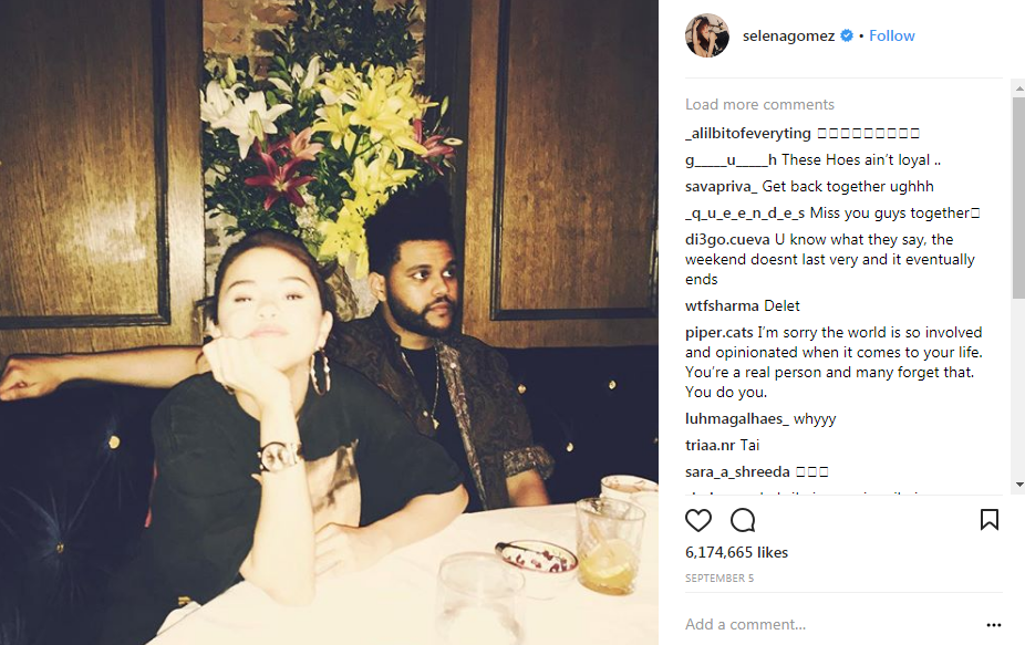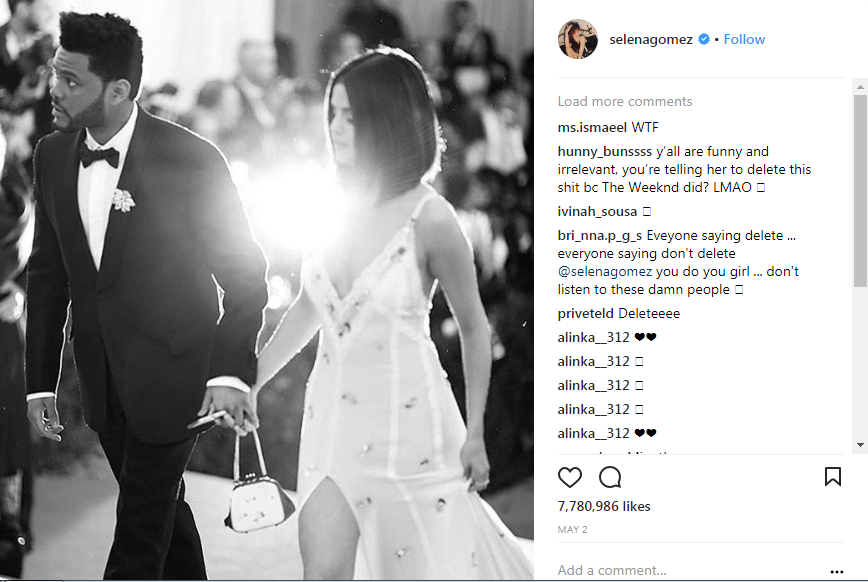 في حين لم تتصرّف "غوميز" بصبيانية ذا ويكند، وأبقت صورهما سوياً على حسابها في موقع إنستقرام، كتلك اللقطة الكلاسيكية التي التقطت لهما بينما كانا سويّاً في حفل Met Gala في نيويورك.