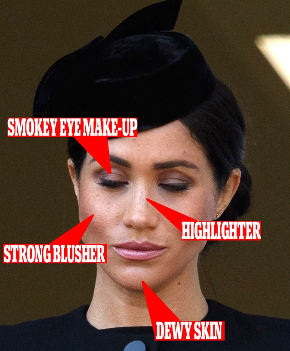 فوفقًا لخبيرة المكياج الشهيرة "لورا كاي"، اختارت "ميغان" إبراز جمالها الهوليوودي بظلال عيون أرجواني وبني، وأبرزَّت عظمتي وجنتيها بهايلايتر لمَّاع؛ لتبدو جميلة من جميع الزوايا ولمنحها مظهرًا شبابيأ وحيويًا. على النقيض من زوجة الأمير ويليام التي اختارت مكياج كلاسيكي أكثر نضوجًا أكسبها مظهرًا جديًة.