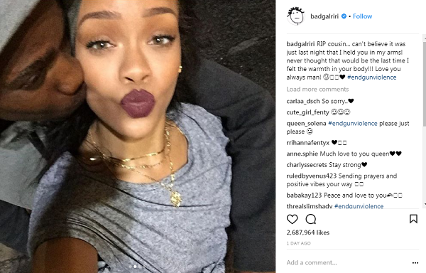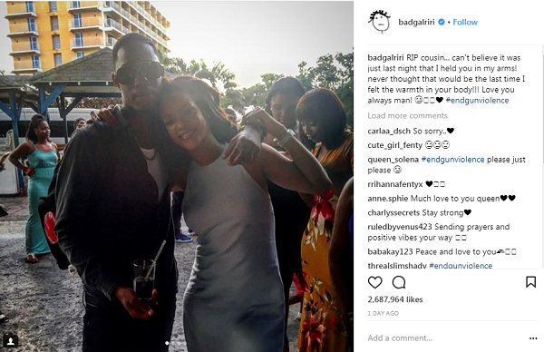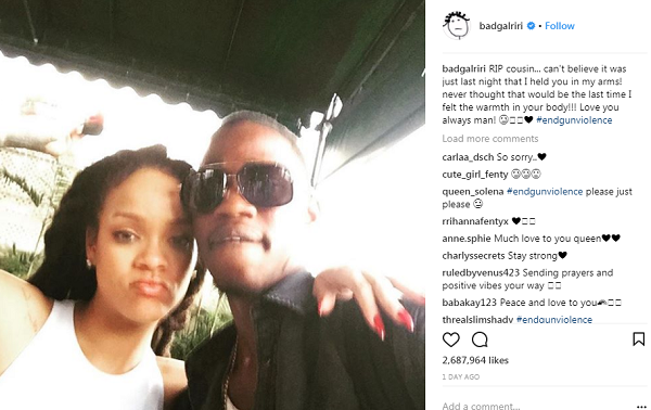 شاركت المغنية العالمية "ريهانا" متابعيها على مواقع التواصل الاجتماعي أحزانها بوفاة ابن عمها "تافون كايزين ألين" (21 عامًا) إثر اصابتة برصاص في جزيرة باربادوس.