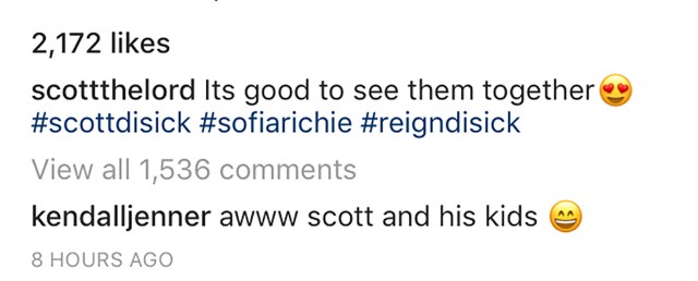 نشر حساب أحدى المعجبين تحت اسم Scottthelord مجموعة صور تجمع "سكوت ديسك" وأطفاله الثلاثة وحبيبته عارضة الازياء الأمريكية "صوفيا ريتشي" البالغة من العمر 19 عامًا، وأرفقها بتعليق جاء فيه: "من الجيد رؤيتهم جميعًا معًا"، وتعليقًا على الصور، كتبت كيندال ساخرةً: "أوووه، سكوت ديسك برفقة أطفاله"، مع وجه إيموجي يضحك.