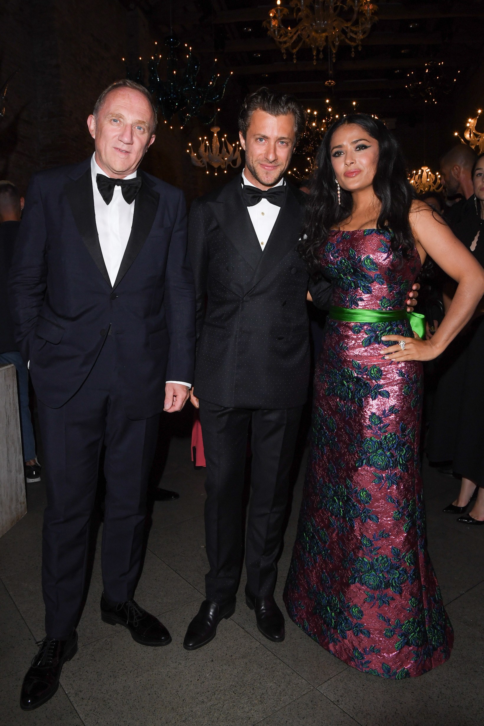 ولهذه المناسبة المهمة، اختارت "سلمى حايك" ذات الأصول اللبنانية التألق بتصميم من توقيع دار أزياء "غوتشي" مرتديةً فستان طيل سترابل أرجواني مُزُيِّنَ بزخارف باللون الأزرق التركوازي، كما زيَّنت خصرها بشريط أخضر فاقع اللون.